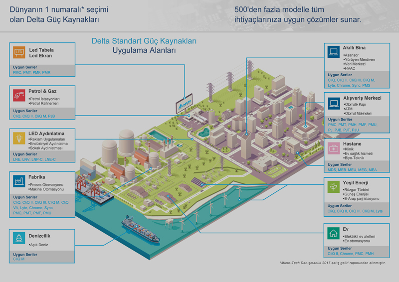 Delta Electronics, 40 yılı aşkın süredir güç kaynağı üretimine liderlik eden global bir firmadır. Başta endüstriyel Otomasyon ve bu alanda üretim yapan makine üreticileri, medikal ve tüketici elektroniği ürünleri üretimi yapan firmalara güç kaynağı üretimi yapmakta ve bu alanda sürekli olarak kendini geliştirmektedir. Ek olarak Fortune 500 listesindeki birçok üst düzey firma tarafından en çok tercih edilen, saygın ve güvenilir bir ODM (Orijinal Tasarım Üreticisi) ünvanını korumaya devam etmektedir. Kaliteden hiçbir şekilde ödün vermeden, özellikle Almanya, Çin, Tayland, ABD ,Avrupa ve bunun dışında dünyanın bir çok ülkesinde Ar&Ge faaliyetlerine devam etmekte ve sürekli olarak yatırımlarını arttırmaktadır.